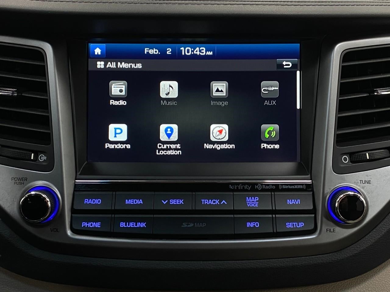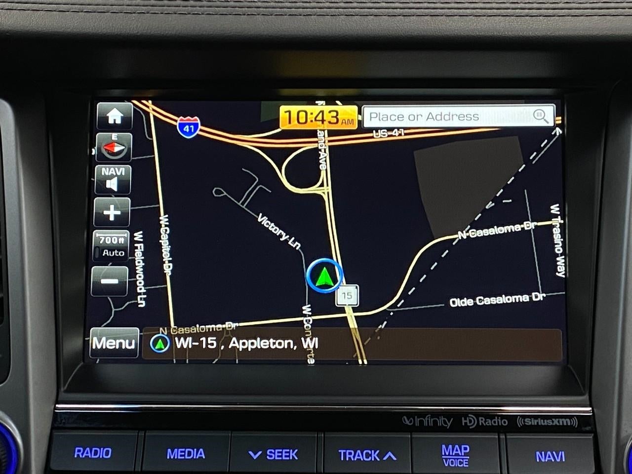 - Radio: Infinity AM/FM/HD Radio/MP3 Audio System -inc: 8" LCD color touchscreen audio display, Android Auto, Apple CarPlay, iPod/USB and auxiliary input jacks, Clari-Fi music restoration, Bluetooth® hands-free phone system, Blue Link telematics system, shark-fin roof antenna, external amp, 8 speakers (2 front-door-mounted, 2 tweeters and 2 rear speakers, center front, subwoofer) and SiriusXM w/90 day trial, Navigation System